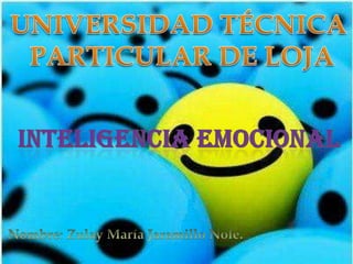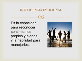 La inteligencia emocional es la capacidad de reconocer sentimientos propios y ajenos y manejarlos. Tiene cinco características principales: conciencia de uno mismo, equilibrio anímico, motivación, control de impulsos y sociabilidad. Estas cualidades incluyen reconocer los propios sentimientos, controlar la ira mediante técnicas como la reconsideración y la relajación, autoinducir emociones positivas, aplazar la satisfacción de deseos y entender las emociones de los demás.