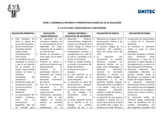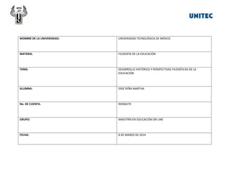 Este documento presenta un resumen del desarrollo histórico y las perspectivas filosóficas de la educación en diferentes épocas, incluyendo la educación primitiva, tradicionalista, en la antigüedad en Grecia y Roma, durante el cristianismo y la edad media con la escolástica, el renacimiento y humanismo, y épocas posteriores como la reforma, racionalismo, empirismo e ilustración. Cubre temas como las primeras formas de educación, el papel de la familia, iglesia