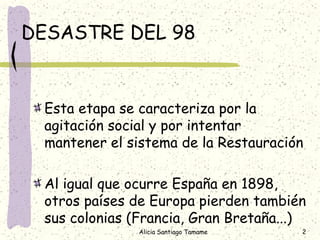 1. La pérdida de las colonias en 1898 llevó a una crisis del Estado con inestabilidad política e intentos fallidos de mantener el sistema de la Restauración.