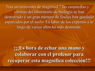 Un terremoto de magnitud 7 destruyó las estanterías y vitrinas de un laboratorio de biología en un museo, esparciendo fósiles por el suelo y destruyendo años de trabajo de expertos. Se pide ayuda para recuperar la valiosa colección de fósiles.