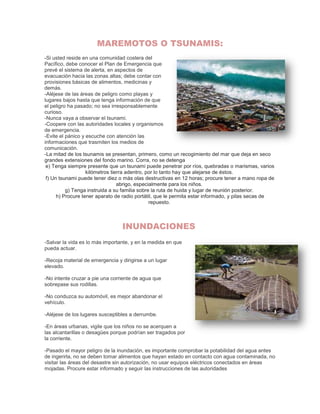 El documento proporciona instrucciones sobre cómo prepararse y actuar ante desastres naturales como terremotos, maremotos, inundaciones y huracanes. Recomienda preparar un kit de emergencia con suministros, asegurar objetos pesados, alejarse de edificios y áreas de peligro durante los desastres, y esperar instrucciones de las autoridades antes de regresar a las zonas afectadas después de que haya pasado el peligro.