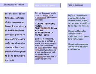 El documento clasifica los desastres en dos categorías principales: desastres naturales y desastres tecnológicos. Los desastres naturales son causados por fenómenos de la naturaleza como sismos, tsunamis, erupciones volcánicas, deslizamientos de tierra, aludes, inundaciones y sequías. Los desastres tecnológicos son causados por el hombre e incluyen incendios, explosiones, derrames químicos, contaminación ambiental, guerras, subversión y terrorismo.