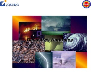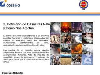 El documento habla sobre desastres naturales, definiéndolos y dando ejemplos de diferentes tipos como terremotos, inundaciones e incendios. También describe algunos de los desastres naturales más devastadores de los últimos años como el tsunami de 2004 en Indonesia, el huracán Katrina en 2005 y los terremotos de Haití y Chile en 2010. Finalmente, ofrece consejos sobre qué hacer antes, durante y después de un desastre natural para estar preparado y protegido.