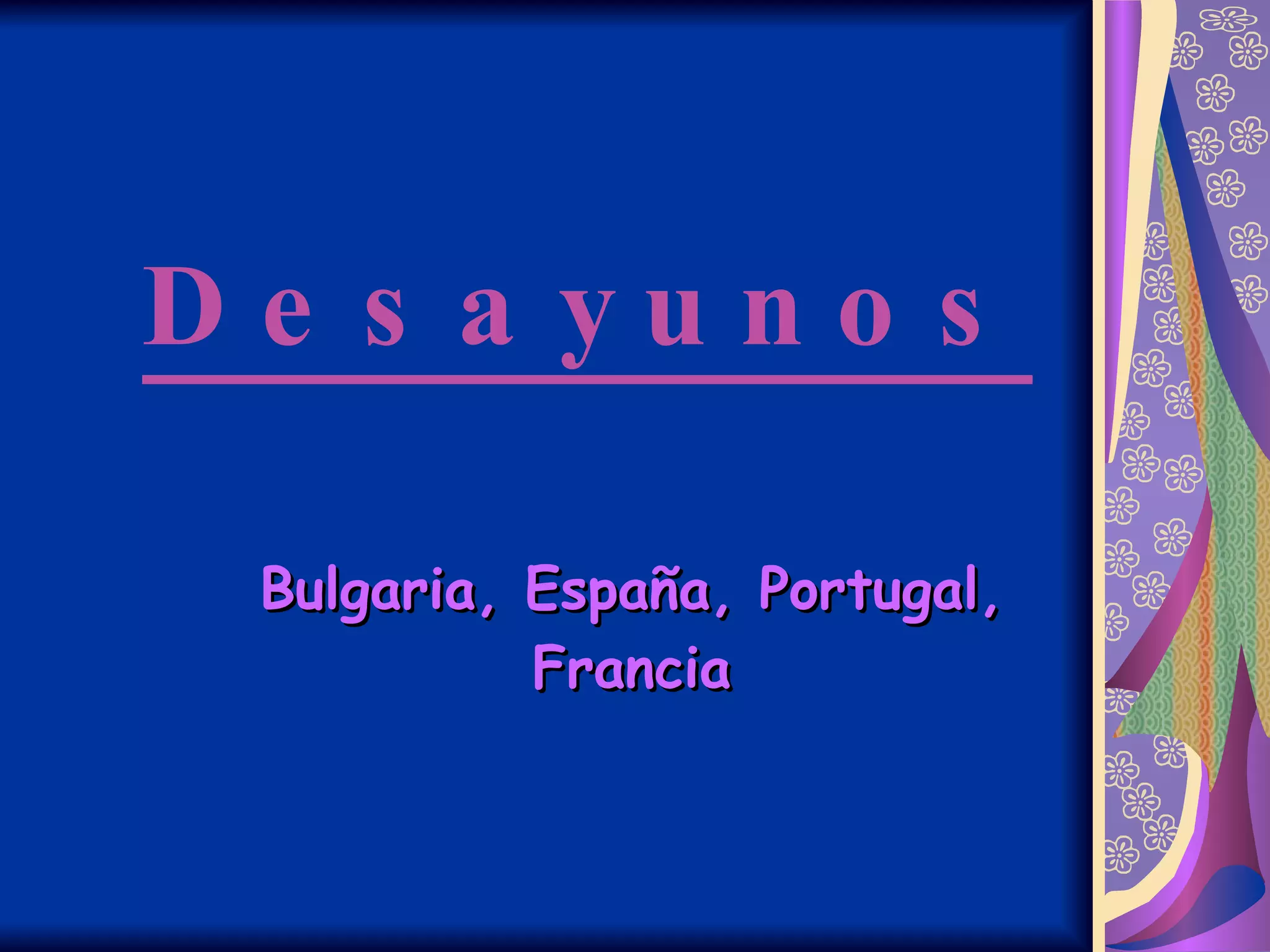 El documento describe los desayunos típicos de Bulgaria, España y Portugal. En Bulgaria, el desayuno tradicional incluye banitsa, que es una pasta enrollada rellena de queso y huevos u otras cosas como manzanas o espinacas. También comen pan frito y beben jugo, café o leche de yogurt. En España, el desayuno común consiste en leche con cacao, tostada con mantequilla y tostada con aceite y jamón. En Portugal, el desayuno puede ser pan con mantequilla o dulces, yog