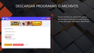 Este documento describe los pasos para descargar programas de forma segura desde internet, incluyendo hacer clic en el enlace de descarga, completar un reCAPTCHA, cerrar ventanas emergentes no deseadas, bloquear notificaciones y esperar a obtener el enlace de descarga antes de iniciar la descarga del archivo.