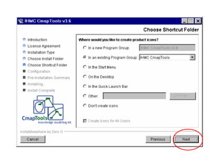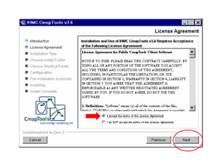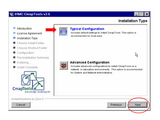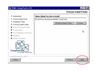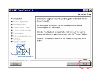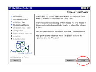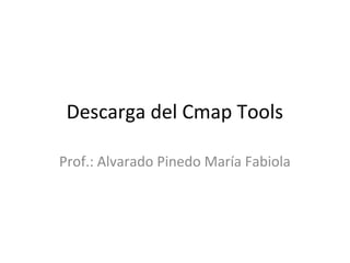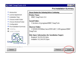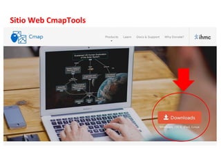 El documento proporciona instrucciones para descargar e instalar el software CmapTools, incluyendo visitar el sitio web de CmapTools, completar los datos personales y elegir el sistema operativo, esperar la descarga y luego guardar y ejecutar el archivo, e iniciar el programa para completar la instalación.