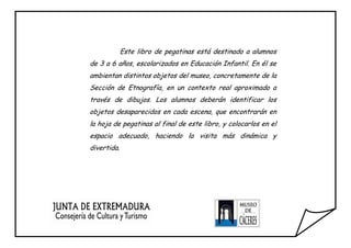 Este libro de pegatinas está destinado a estudiantes de 3 a 6 años y presenta escenas ambientadas en un museo de etnografía para que los estudiantes identifiquen y coloquen objetos faltantes. El libro hace que la visita al museo sea más dinámica y divertida a través de dibujos que muestran actividades como la producción de pan, aceite de oliva, vino, pesca en el río Tajo, lana para jerseys y una fiesta en Montehermoso.