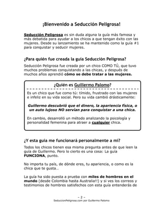 La guía 'Seduction Peligrosa', creada por Guillermo Palomo, es un recurso popular para ayudar a los hombres a atraer y seducir mujeres a través de un método basado en la psicología femenina. Ofrece un enfoque práctico en cinco pasos para mejorar la interacción con las mujeres y promete resultados probados a nivel global. La guía está disponible para descarga inmediata con una oferta de descuento por tiempo limitado.
