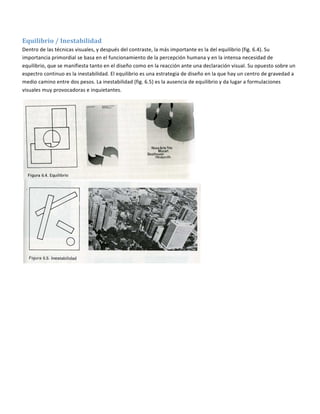 El documento describe diferentes técnicas de comunicación visual y sus opuestos en forma de dipolos a lo largo de un continuo. Las técnicas discutidas incluyen contraste/semejanza, equilibrio/inestabilidad, simetría/asimetría, regularidad/irregularidad, simplicidad/complejidad, unidad/fragmentación, y economía/profusión. El autor explica cómo estas técnicas pueden usarse para expresar diferentes significados a través de la composición visual.
