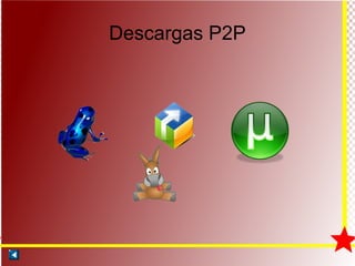 Este documento resume las redes P2P (Peer-to-Peer), definidas como redes entre iguales donde los ordenadores actúan como clientes y servidores. Explica que las primeras redes P2P se crearon en 2001 y que tienen aplicaciones como el intercambio de archivos, sistemas de telefonía por Internet y cálculos científicos. Describe los tipos de redes P2P y programas como BitTorrent, eMule y Ares, además de alternativas como descargas directas y P4P. Finalmente, analiza la situación legal de
