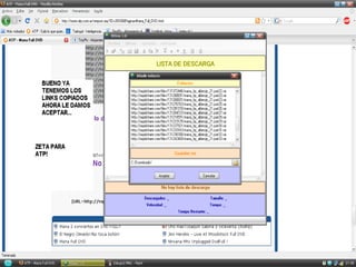 El documento describe diferentes métodos para automatizar descargas de archivos de Internet, incluyendo gestores de descargas, redes P2P como BitTorrent, e IRC. Explica cómo funcionan estos métodos, ejemplos de software populares para cada uno, y brevemente menciona problemas legales relacionados al compartir archivos protegidos.
