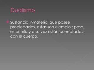El documento resume las ideas centrales del dualismo cartesiano. Explica que Descartes propuso que la mente es una sustancia inmaterial distinta del cuerpo. A través de la duda metódica, Descartes llegó a la certeza de que "pienso, luego existo", estableciendo que lo único que no puede dudar es su propia existencia como cosa que piensa. Finalmente, el documento señala que Descartes argumentó la existencia de Dios como garantía de la veracidad de nuestras ideas claras y distintas.