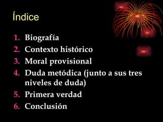 René Descartes fue un filósofo francés del siglo XVII que buscó establecer un método fiable para alcanzar la verdad. A través de un proceso de duda metódica que puso en duda los sentidos, la distinción entre sueño y vigilia, e incluso la posibilidad de un genio maligno, Descartes llegó a su primera verdad: "Yo pienso, luego existo".