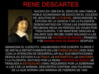 El documento presenta información sobre René Descartes y su método filosófico. Descartes desarrolló un método deductivo basado en la intuición y deducción para establecer verdades ciertas. Parte de la duda metódica universal y llega a la primera verdad indubitable "pienso, luego existo". A partir de ahí deduce la existencia de Dios y distingue tres sustancias: res cogitans (mente), res extensa (cuerpo) y la sustancia infinita (Dios).