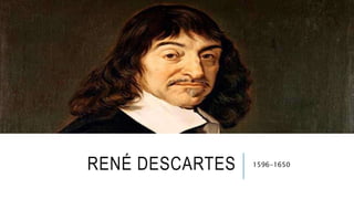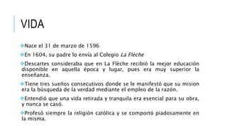 René Descartes vivió entre 1596-1650. Fue educado en el Colegio La Flèche donde recibió una excelente educación. Escribió obras como el Discurso del Método y las Meditaciones Metafísicas donde desarrolló su método filosófico basado en la duda metódica y el "pienso, luego existo" para establecer verdades ciertas. Buscaba establecer un sistema filosófico basado en ideas claras y distintas que no dependiera de autoridad alguna.