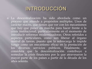 El documento discute los conceptos de descentralización, centralización y diferentes tipos de descentralización. Explica que la descentralización implica transferir poder de un gobierno central a autoridades no jerárquicamente sometidas. Describe la descentralización administrativa, política, funcional, fiscal y mixta, y discute los factores que explican la presión hacia esquemas descentralizados como la demanda por mayor participación y eficiencia.