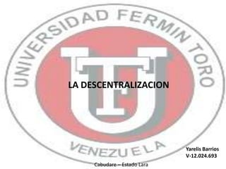 El documento describe la descentralización en Venezuela, incluyendo definiciones, características, antecedentes y el proceso actual. Explica que la descentralización busca transferir autonomía a niveles locales según la constitución. También describe las organizaciones como comunas, consejos comunales y comunidades organizadas que reciben competencias de entes públicos. Finalmente, explica los consejos como el Federal de Gobierno y los locales y estadales de planificación pública.