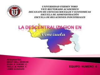 Este documento resume la descentralización en Venezuela. Define la descentralización como el proceso de transferir autoridad y recursos de los niveles superiores a los inferiores de una organización. Explica que la descentralización en Venezuela tiene el objetivo de hacer la administración pública más eficiente y permitir el desarrollo de instituciones a nivel estatal y municipal. También resume la Ley Orgánica de Descentralización de 1984 y sus objetivos de abrir espacios de participación ciudadana y hacer que el gobierno central se enfoque en problemas nacionales.