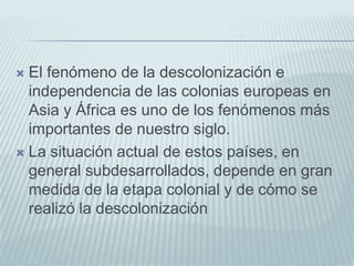 Este documento resume el proceso de descolonización en Asia y África después de la Segunda Guerra Mundial. Explica los factores internos y externos que llevaron a la independencia de las colonias, incluyendo el nacionalismo, las nuevas ideologías y la debilidad de las potencias coloniales después de la guerra. Describe las diferentes etapas y tipos de descolonización, con ejemplos como la India, Indochina y el norte de África. Finalmente, resume los procesos de independencia específicos en varias regiones de Asia