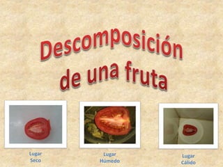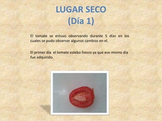 El documento describe los cambios observados en tomates durante 5 días en 3 lugares diferentes: seco, húmedo y cálido. En el lugar seco, el tomate se ablandó y perdió color, llegando a estar casi chupado y sin color rojizo al día 5. En el lugar húmedo, el tomate cambió de rojo a amarillento manteniéndose duro, aunque blanco en la parte superior al día 5. En el lugar cálido, el tomate se puso más blando y aguado manteniendo el color rojo, hasta estar chup