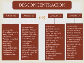 El documento habla sobre la desconcentración de las escuelas dependientes de la Secretaría de Educación Pública en México. Estas escuelas ofrecen educación primaria y primaria bilingüe bicultural, principalmente en el Distrito Federal. La educación primaria bilingüe en las entidades federativas será organizada y supervisada por las delegaciones generales de la Secretaría. Las escuelas privadas autorizadas también estarán sujetas a la supervisión de las direcciones generales de educación primaria e indígena. Las escuelas primarias