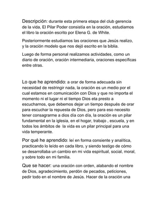 El documento describe las actividades de un club de oración, incluyendo el estudio del libro "La oración" de Elena G. White, las oraciones de Jesús en la Biblia, y ejercicios personales como un diario de oración. El autor aprendió que la oración es una comunicación con Dios en cualquier momento o lugar, y que es importante dejar tiempo para escuchar la respuesta de Dios a través de la consagración diaria.