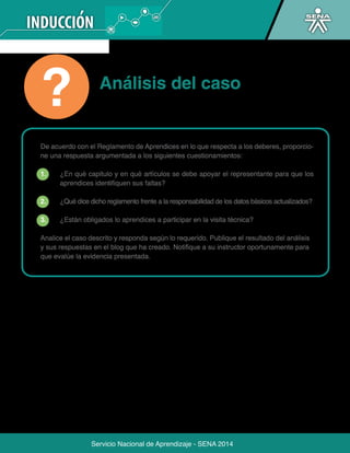 El instructor de SENA requiere que tres aprendices traigan su cédula de ciudadanía al cumplir la mayoría de edad, ya que anteriormente solo tenían tarjeta de identidad y deben cumplir con un plan de mejora. Existe preocupación adicional por el acceso no autorizado a la plataforma virtual y la negativa de uno de los aprendices a participar en salidas técnicas. Se solicita al representante de los aprendices que ubique los errores en el reglamento y se les pide que analicen y publiquen sus respuestas al caso en un blog.