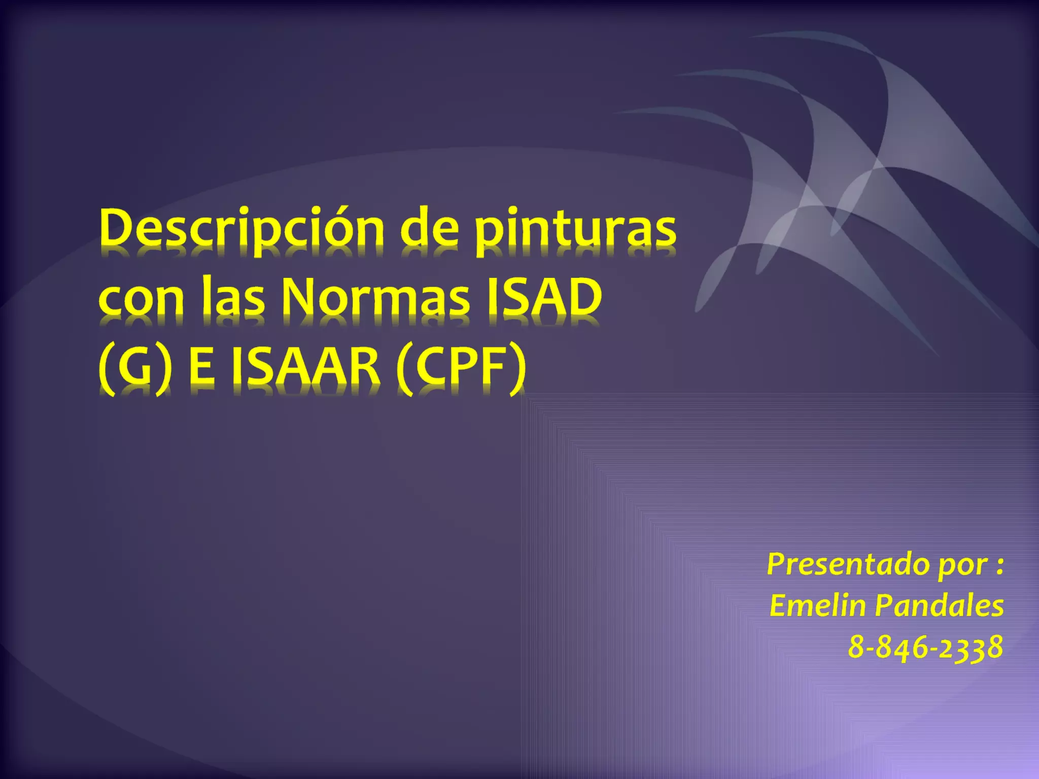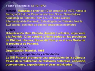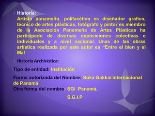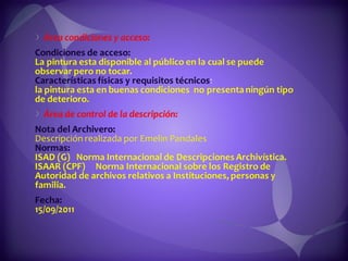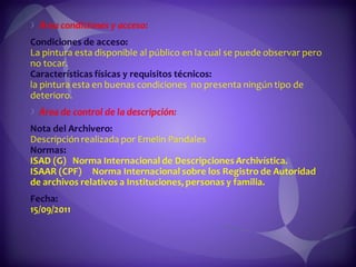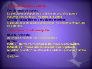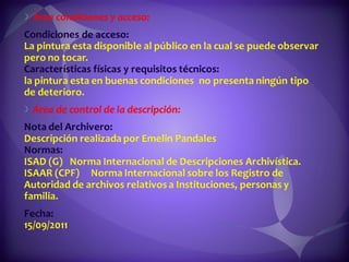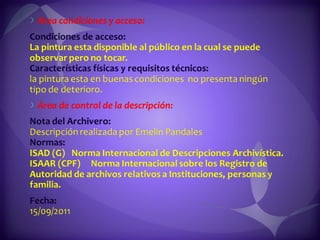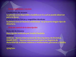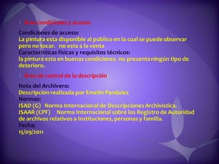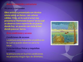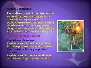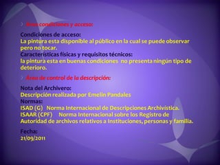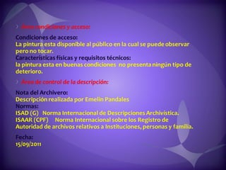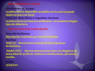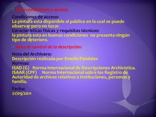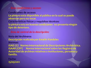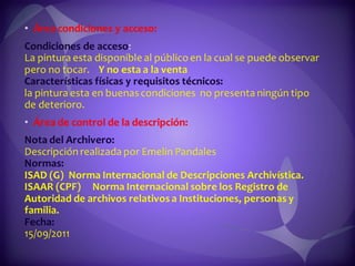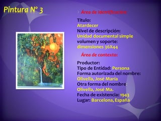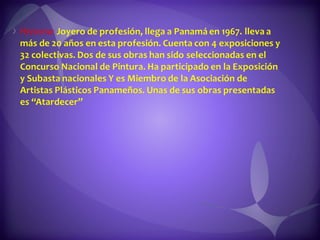 Este documento contiene descripciones de 20 obras de arte de diferentes artistas panameños. Cada descripción incluye información sobre el título, el artista, la técnica artística utilizada y una breve descripción del contenido de la obra. Los documentos proporcionan metadatos sobre colecciones de pinturas y cuadros que representan paisajes, retratos y otros temas panameños.