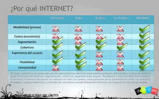 El documento destaca las ventajas de utilizar internet para la publicidad, especialmente en términos de medición de resultados y costos. Se menciona cómo Google y las redes sociales pueden ser herramientas efectivas para alcanzar audiencias específicas mediante contenido relevante y segmentación. También se resalta la importancia de mejorar el posicionamiento en buscadores y crear comunidades en plataformas como Facebook.