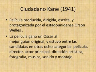 El documento resume brevemente 5 películas importantes: Ciudadano Kane (1941), Casablanca (1942), El Padrino (1972), Lo que el viento se llevó (1939). Describe los directores, años de producción, premios ganados y su importancia histórica para el cine.