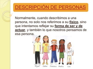 Este documento ofrece consejos para describir a una persona de manera efectiva. Explica que una descripción debe incluir tanto rasgos físicos como de carácter. Proporciona una guía de tres pasos: 1) planificar observando los rasgos más característicos, 2) escribir la descripción comenzando con la presentación y luego detallando el físico y personalidad, y 3) revisar la descripción. También incluye ejemplos detallados de rasgos físicos y de carácter que se pueden incluir.
