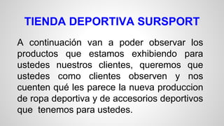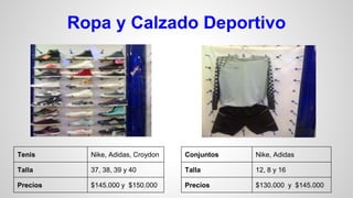 La tienda deportiva Sursport está exhibiendo una variedad de ropa deportiva, calzado, y accesorios para clientes. Los productos incluyen tenis, conjuntos, pantalonetas y camisas de marcas como Nike, Adidas y más, en diferentes tallas y colores, con precios que van desde $35.000 hasta $170.000. También ofrecen accesorios como espinilleras, muñequeras, balones, gorras, gafas, tulas y maletas de marcas como Lotto, Golty, Converse, Oakley, Fila, Nike