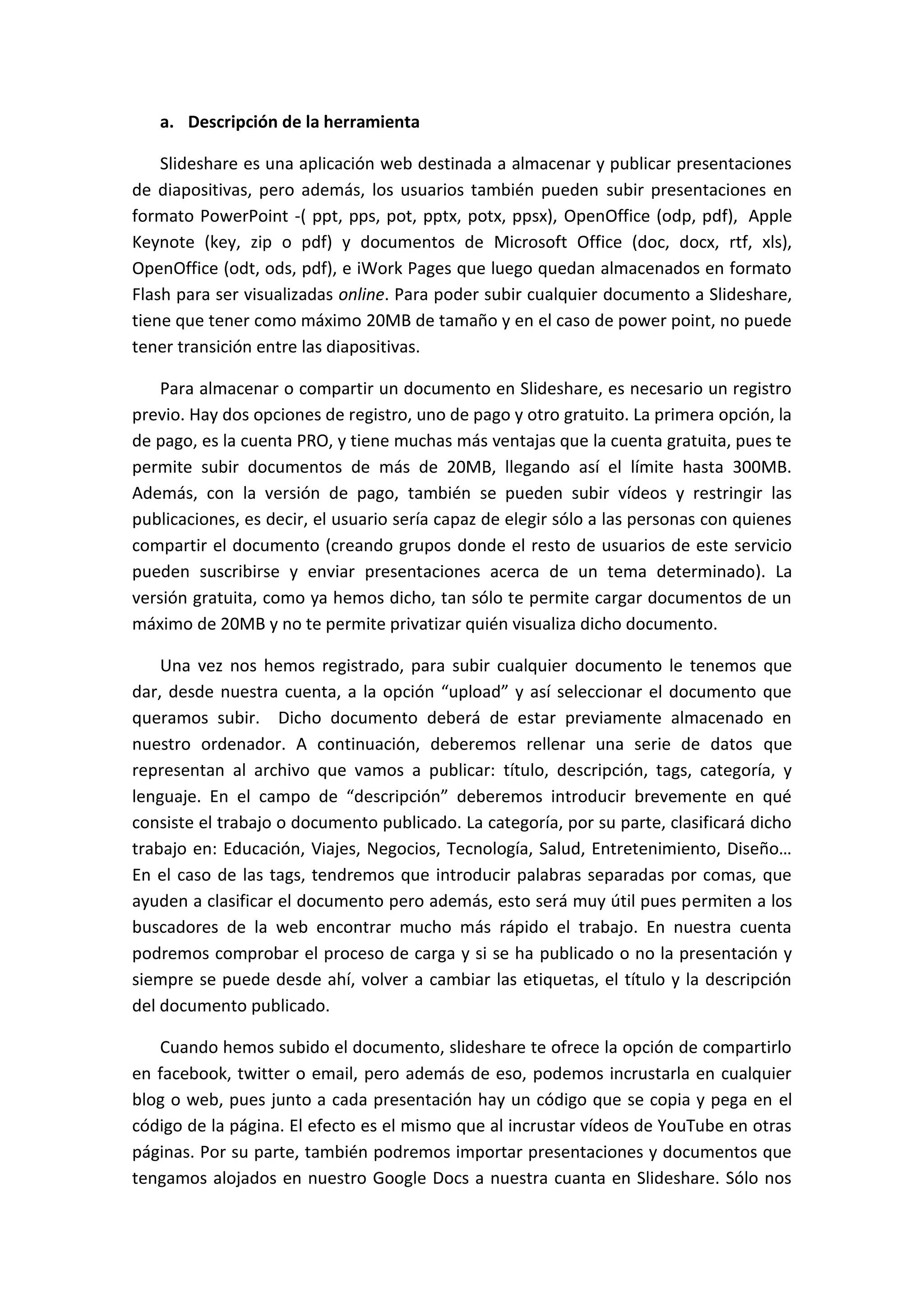 Slideshare es una aplicación web para almacenar y publicar presentaciones. Los usuarios pueden subir documentos en formatos como PowerPoint, PDF y documentos de Microsoft Office. Existen cuentas gratuitas y de pago, siendo esta última la que permite mayores funcionalidades como subir archivos más grandes y restringir el acceso. Una vez cargado, el documento se convierte a formato Flash para su visualización online. Slideshare ofrece diversas opciones para compartir y buscar presentaciones.