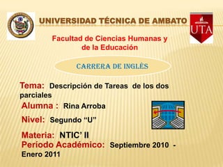 El documento describe las tareas de los dos parciales para la materia NTIC II. En el primer parcial, las tareas incluyen crear una guía de instalación del programa Hot Potatoes, una guía de funcionamiento de sus subprogramas, y aplicaciones usando los programas de Hot Potatoes. En el segundo parcial, las tareas son crear una guía de uso de Dropbox, una guía de instalación de Swish, un currículo vitae en Swish, y un blog con encuesta, fotos, presentación de tareas y un video entrevista. Todas las tareas del