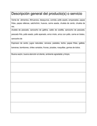 La empresa se dedica a la venta de alimentos como almuerzos, desayunos, pollo asado y otros productos. Fue fundada en 2010 y ofrece buena atención al cliente en un ambiente limpio. Su propietaria decidió ser empresaria para cumplir un sueño y lograr la independencia laboral, aunque requiere más tiempo de trabajo.