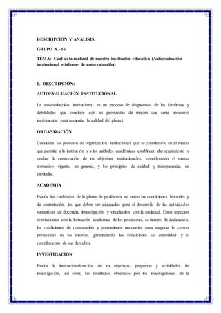 El documento describe los componentes de una autoevaluación institucional de una universidad, incluyendo la evaluación de la organización, la facultad, la investigación, la vinculación con la sociedad, los recursos e infraestructura, y los estudiantes. La autoevaluación institucional es un proceso para diagnosticar las fortalezas y debilidades de una universidad y proponer mejoras para aumentar la calidad.