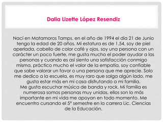 Dalia tiene 20 años y nació en Matamoros, Tamaulipas. Actualmente cursa el quinto semestre de la licenciatura en Ciencias de la Educación. Aunque inicialmente quería estudiar Psicología, ha llegado a amar su carrera educativa porque le permite enseñar y transmitir valores a los niños, lo que la llena de satisfacción. Su aspiración a futuro es crear seres humanos mejores mediante su trabajo docente y vincular el aula con la sociedad para brindar conocimientos relevantes que puedan mejorar la vida
