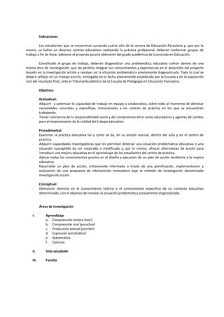 Este documento describe un proyecto de investigación-acción que los estudiantes de pedagogía en educación parvularia deben completar para obtener su grado de Licenciado en Educación. El proyecto involucra diagnosticar un problema educativo en el centro de práctica del estudiante, diseñar e implementar un plan de acción para abordar el problema, y evaluar los resultados. El proyecto busca desarrollar habilidades investigativas y de liderazgo en los estudiantes, y mejorar la calidad educativa en los centros de pr