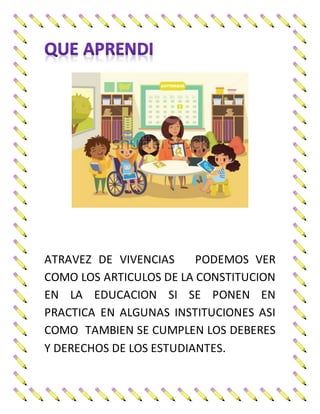 El documento habla sobre la primera clase donde el licenciado compartió artículos de la constitución sobre educación y los estudiantes realizaron un cuadro sobre si la educación cumple o no con cada artículo. También menciona que a través de experiencias se puede ver cómo algunos artículos de la constitución sobre educación se aplican en algunas instituciones al igual que los deberes y derechos de los estudiantes.