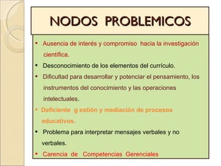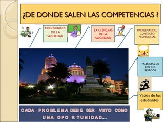 El documento habla sobre las competencias, sus elementos y cómo describirlas. Explica que las competencias se basan en las necesidades de la sociedad y las exigencias profesionales. Detalla los componentes de una competencia como el verbo de acción, objeto, fin y condición de calidad. Además, explica que los estándares y niveles de logro son importantes para evaluar el desarrollo de las competencias en los estudiantes.