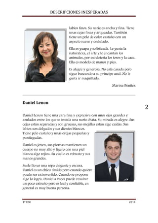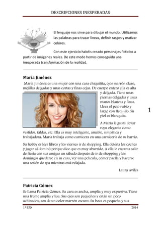 Este documento contiene descripciones físicas y de personalidad de varios personajes ficticios creados por estudiantes de 1o de ESO. Cada descripción incluye detalles sobre la apariencia física, estilo de vida, profesión y gustos de cada personaje.