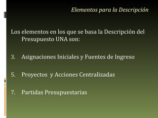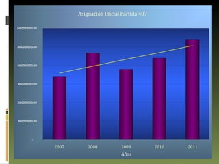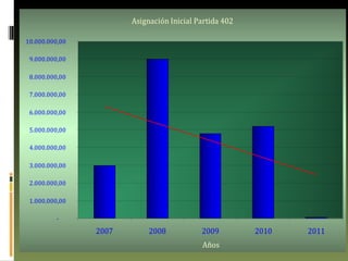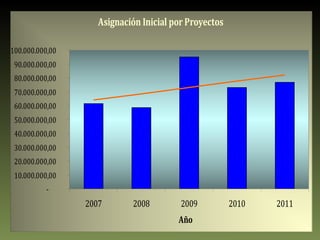 Este documento resume el presupuesto de la Universidad Nacional Abierta entre 2007 y 2011, incluyendo las asignaciones iniciales, fuentes de ingresos, distribución por proyectos y partidas presupuestarias. Muestra que las asignaciones iniciales aumentaron durante este periodo, pero la distribución cambió, con una mayor proporción asignada a acciones centralizadas en lugar de proyectos. También analiza cómo los indicadores de inflación como el INPC y la unidad tributaria deben ser considerados para proyectar de manera más precisa los montos asignados.
