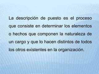 Este documento describe los procesos de descripción y análisis de puestos de trabajo. La descripción de puestos consiste en determinar los elementos que componen la naturaleza de un cargo, mientras que el análisis de puestos estudia los requisitos y responsabilidades de cada cargo. El documento también explica los tipos de descripciones, evaluaciones y perfiles ocupacionales, así como las etapas del análisis de puestos y sus objetivos.