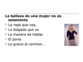 El documento describe las características de la verdadera belleza en una mujer. Enumera siete cualidades que constituyen la belleza interior en lugar de la apariencia física: la espiritualidad, la humildad, la generosidad, la confianza en sí misma, la inteligencia, el bienestar físico y el sentido del humor. El propósito es enfatizar que la belleza verdadera se basa en virtudes como la bondad, la fe y la autoestima más que en atributos superficiales.