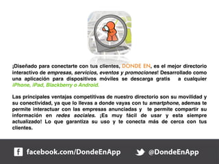 El documento describe el directorio móvil DONDE EN, una aplicación gratuita disponible para diferentes dispositivos móviles que permite a las empresas publicar información y conectarse con clientes de manera interactiva. El directorio ofrece información sobre empresas, eventos y promociones en diferentes ciudades y ha tenido más de 7,000 descargas en sus 6 meses desde el lanzamiento.