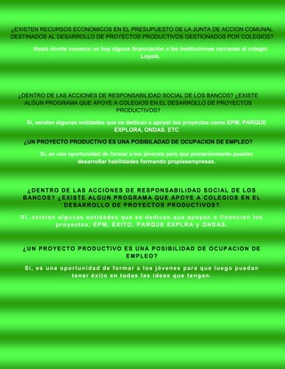 El resumen describe la ubicación del colegio en Medellín, Colombia y cómo el sector se dedica principalmente a la actividad comercial. Se mencionan proyectos potenciales como vivienda para zonas vulnerables y limpieza de zonas verdes con la comunidad escolar. Existen recursos en el presupuesto escolar y de organizaciones como EPM, Parque Explora y Ondas para apoyar proyectos productivos estudiantiles que pueden conducir a oportunidades laborales futuros.