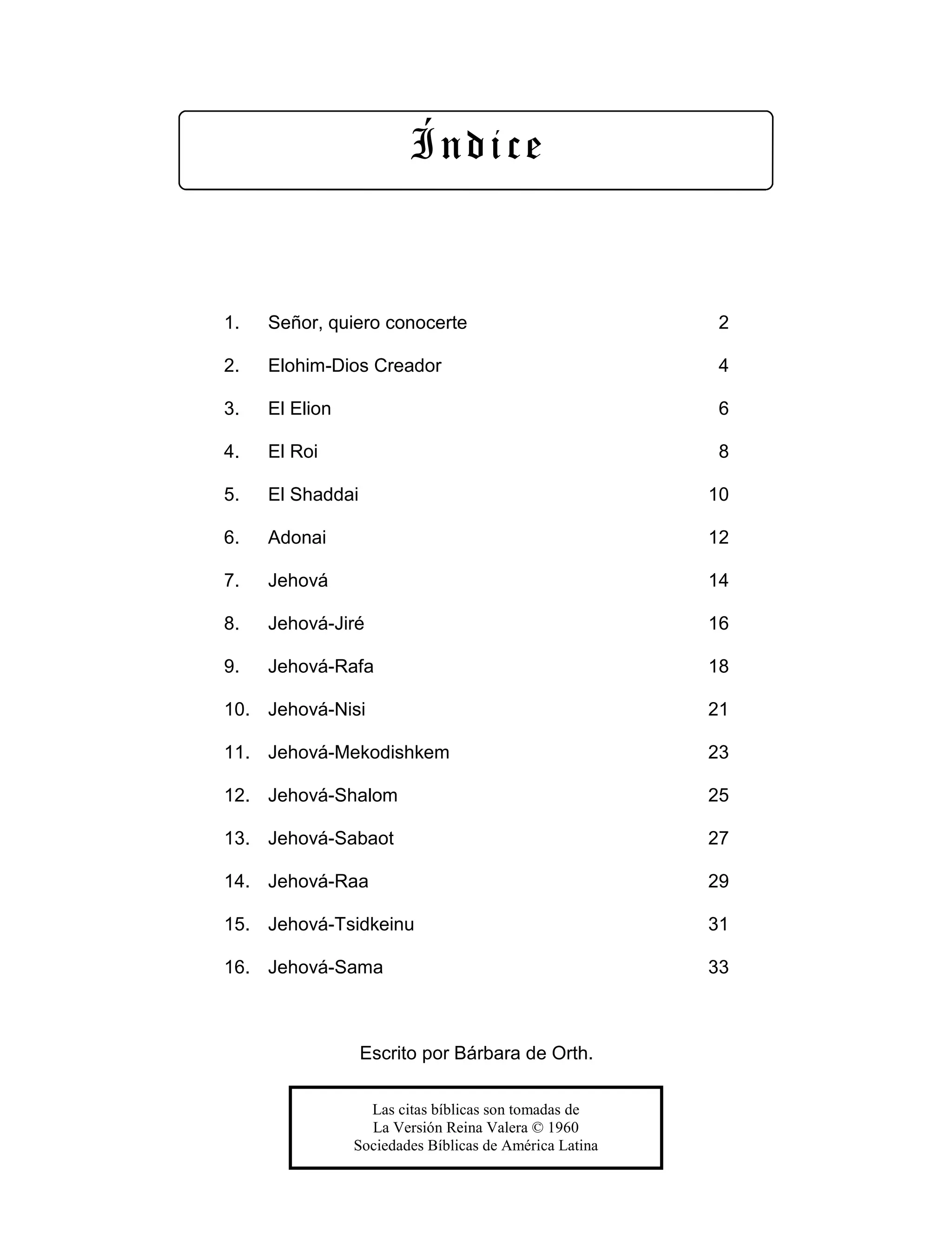 El documento presenta un índice de 16 lecciones sobre diferentes nombres de Dios en la Biblia. La segunda lección se enfoca en el nombre "Elohim" y discute cómo Elohim es el Creador soberano que formó a los seres humanos y toda la creación. La lección también explora las implicaciones de que Dios nos creó, incluyendo nuestra dignidad y propósito de alabar a Dios como nuestro Creador.