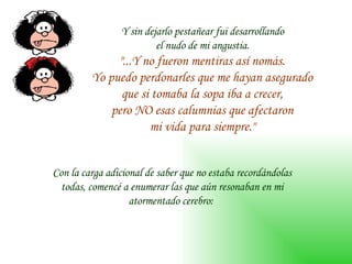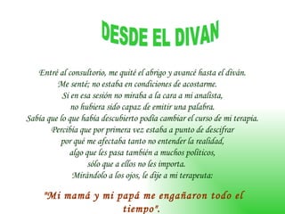 El paciente se sienta en el diván del psicoanalista y le confiesa que sus padres le mintieron constantemente durante su vida. Enumera varias mentiras y engaños que sus padres le dijeron y que afectaron su forma de ver la realidad, como que la policía siempre ayuda, que en la Argentina nadie se muere de hambre y que después de jubilarse se vive sin trabajar. Al terminar de contar esto, tanto él como su terapeuta se ponen a llorar al darse cuenta de cuánto crecieron engañados.