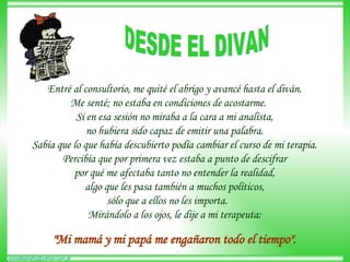 El paciente se sienta en el diván frente a su terapeuta, listo para revelar el descubrimiento que puede cambiar el curso de su terapia. Le dice que sus padres lo engañaron constantemente cuando era niño a través de mentiras y calumnias que afectaron su vida. Comienza a enumerar las falsas afirmaciones que sus padres le dijeron y que resonaban en su mente atormentada, como que la policía siempre ayuda y que en la Argentina nadie se muere de hambre. Al terminar, se arrepiente de ver la cara de