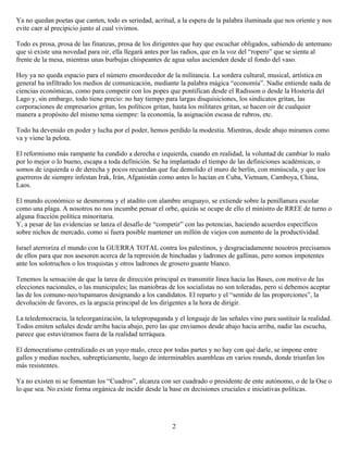 Este documento presenta reflexiones críticas sobre el Frente Amplio y su gobierno desde una perspectiva de base. Critica que se haya roto la comunicación entre la dirección del FA y sus militantes de base, y que primen ahora el cargo y el poder sobre la modestia. También cuestiona que se haya reemplazado la democracia participativa por el centralismo democrático, priorizando la línea del partido sobre la iniciativa individual. Finalmente, plantea que los intentos de reforma corren el riesgo de terminar en mera retórica si no